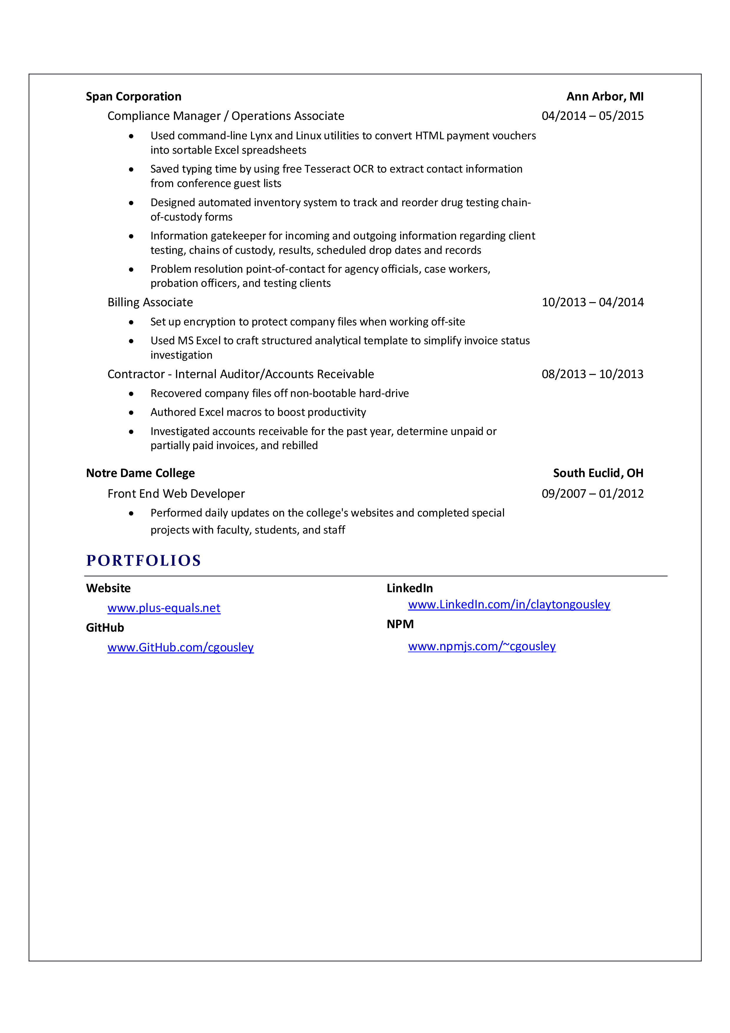 I have over eight years of experience in full-stack development and design. I built enterprise APIs and Chrome Extensions for Jackson Dawson, and four websites for Ford, (including Mustang debut apps for two autoshows), BI Worldwide, GM, ExxonMobil, Toyota, Navistar, Webasto, Notre Dame College, Discovery Solutions, Inc., and completed a full-stack shopping cart application with Paypal REST API integration for Savons Michele. I also developed a JavaScript userscript for ADP while serving as a Technical Controls Specialist.